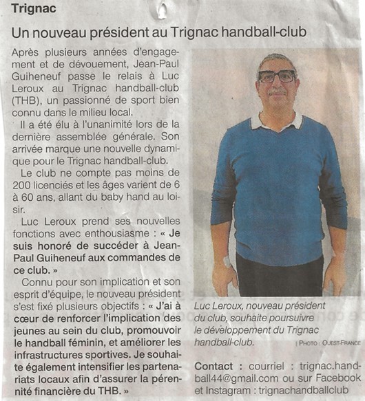 Après plusieurs années d’engagement et de dévouement, Jean-Paul Guiheneuf passe le relais à Luc Leroux au Trignac handball-club (THB), un passionné de sport bien connu dans le milieu local.